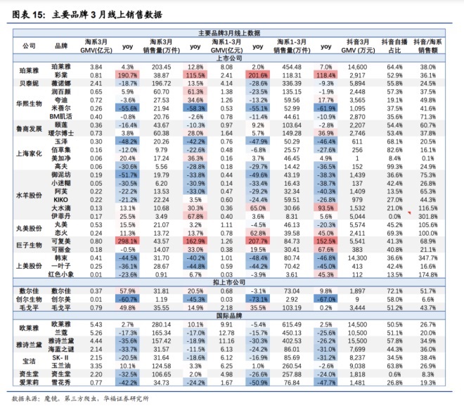 據華福證券研報,今年1-3月淘系銷售口徑顯示,歐萊雅集團旗下蘭蔻,雅詩蘭黛集團旗下雅詩蘭黛、海藍之謎,寶潔旗下SK-II,資生堂旗下資生堂品牌,GMV與銷售量均同比錄得雙位數下滑,其中雅詩蘭黛GMV下滑超30%,銷售量下滑26.2%。本土品牌方面,華熙生物的潤百顏,貝泰妮的薇諾娜,上海家化的玉澤、佰草集,水羊股份御泥坊等都沒能逃脫GMV大幅下滑的命運。