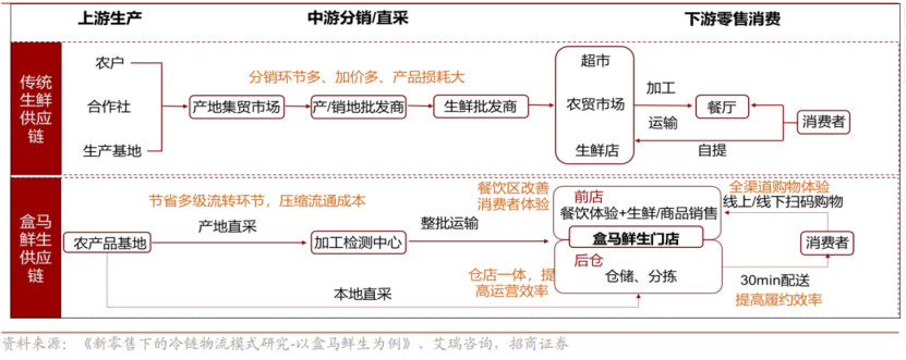 盒馬之所以能夠給用戶提供線上、線下都近乎完美的購物體驗,背后少不了在供應(yīng)鏈各環(huán)節(jié)上的深耕。對比傳統(tǒng)生鮮供應(yīng)鏈體系,盒馬采用產(chǎn)地直采以及倉店一體等手段減少了鏈路環(huán)節(jié),降低流轉(zhuǎn)成本進(jìn)而實現(xiàn)運營效率有效提升。
