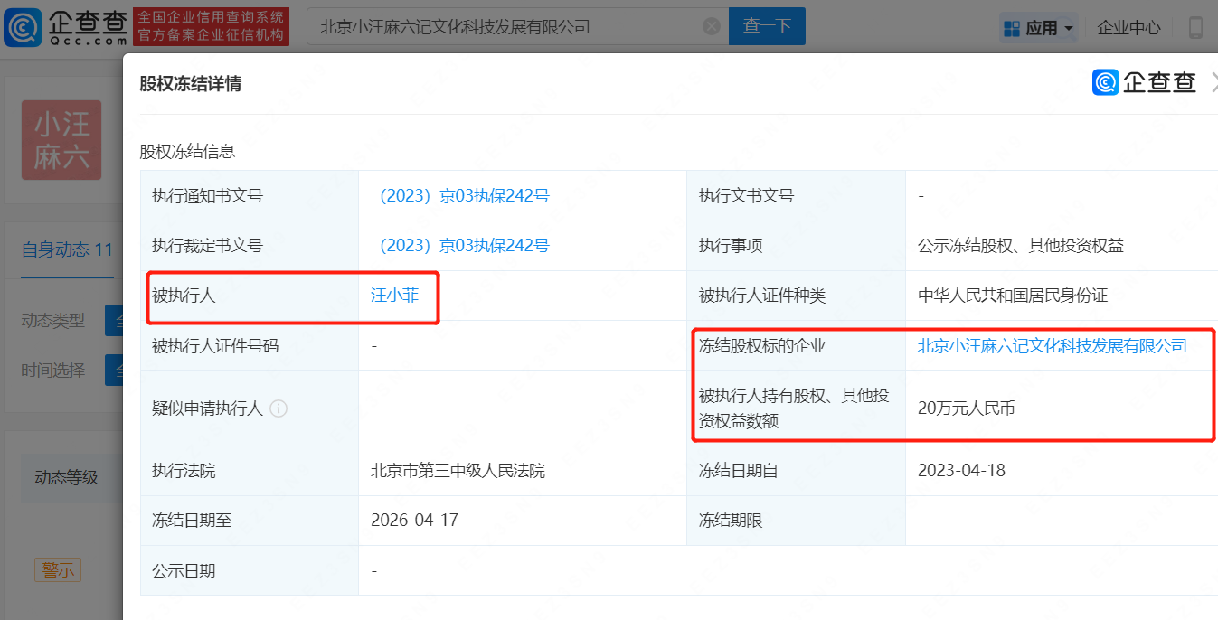 聯(lián)商快訊:企查查APP顯示,近日,汪小菲持股公司北京小汪麻六記文化科技發(fā)展有限公司新增一則股權(quán)凍結(jié)信息,被執(zhí)行人為汪小菲,被凍結(jié)股權(quán)數(shù)額為20萬元,執(zhí)行法院為北京市第三中級(jí)人民法院,凍結(jié)日期為2023年4月18日至2026年4月17日。