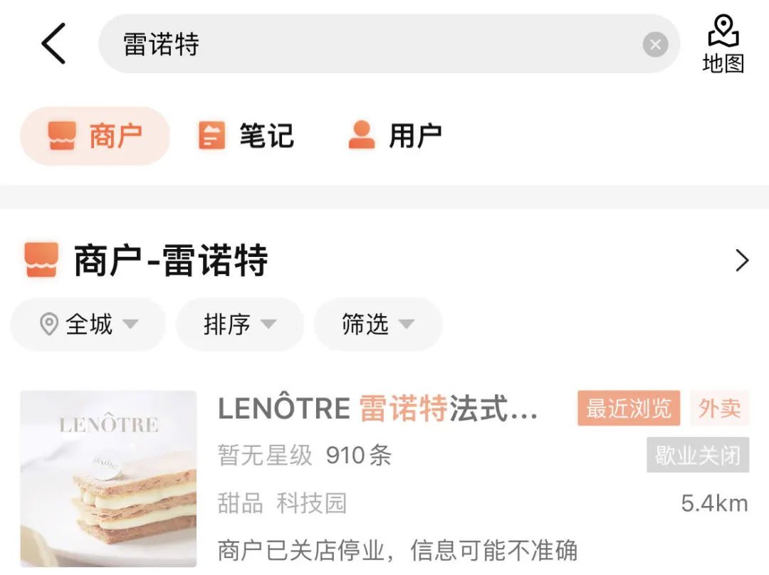 搜索大眾點(diǎn)評(píng)發(fā)現(xiàn),“LENÔTRE雷諾特法式西點(diǎn)(萬象天地店)”顯示狀態(tài)為歇業(yè)關(guān)閉。
