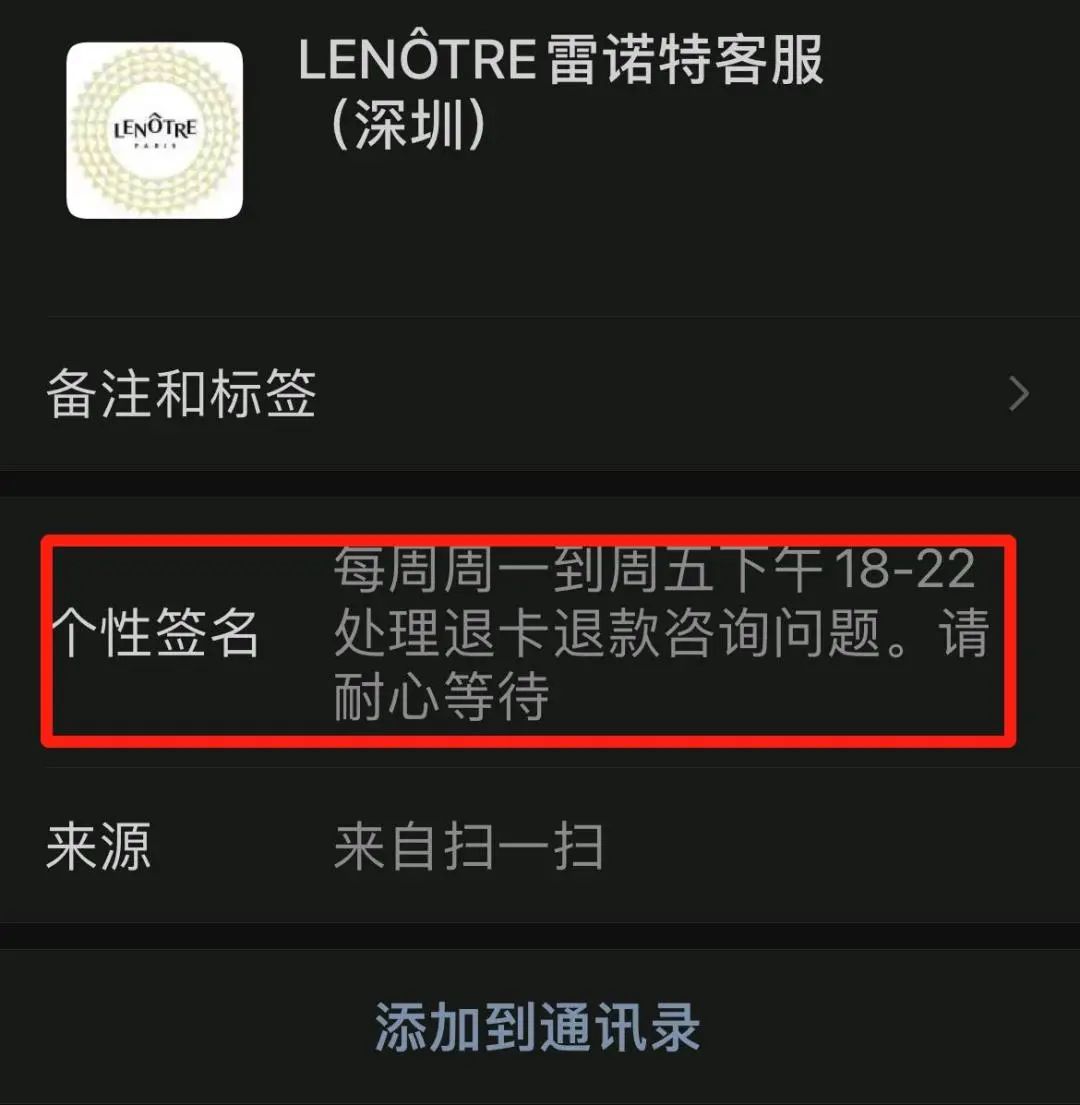 此外,筆者通過公眾號(hào)上留的聯(lián)系方式聯(lián)系品牌深圳客服,個(gè)性簽名顯示“周一至周五下午18-22處理退卡退款咨詢問題”。