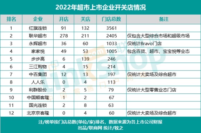 據(jù)聯(lián)商網(wǎng)零售研究中心統(tǒng)計(jì),12家超市上市企業(yè)在2022年新開481家門店,卻關(guān)閉了646家門店;截至2022年末,12家超市上市企業(yè)門店總數(shù)9043家。(注:多數(shù)企業(yè)均統(tǒng)計(jì)大賣場(chǎng)、綜合超市等大型門店)
