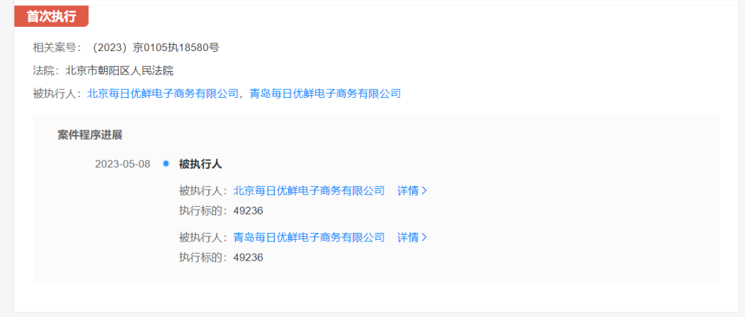 具體來看,5月8日,北京每日優(yōu)鮮電子商務(wù)有限公司和青島每日優(yōu)鮮電子商務(wù)有限公司被北京市朝陽區(qū)人民法院列為被執(zhí)行人,執(zhí)行標的4.92萬元,執(zhí)行案號(2023)京0105執(zhí)18580號。