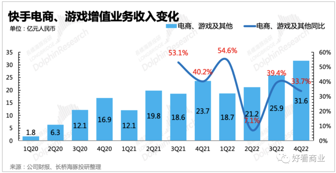 2022年Q4,在全國新冠感染高峰期,快手電商實(shí)現(xiàn)營收31.6億元,同比增長33.7%。Q4直播電商GMV 達(dá)3124億元,同比增長30%。