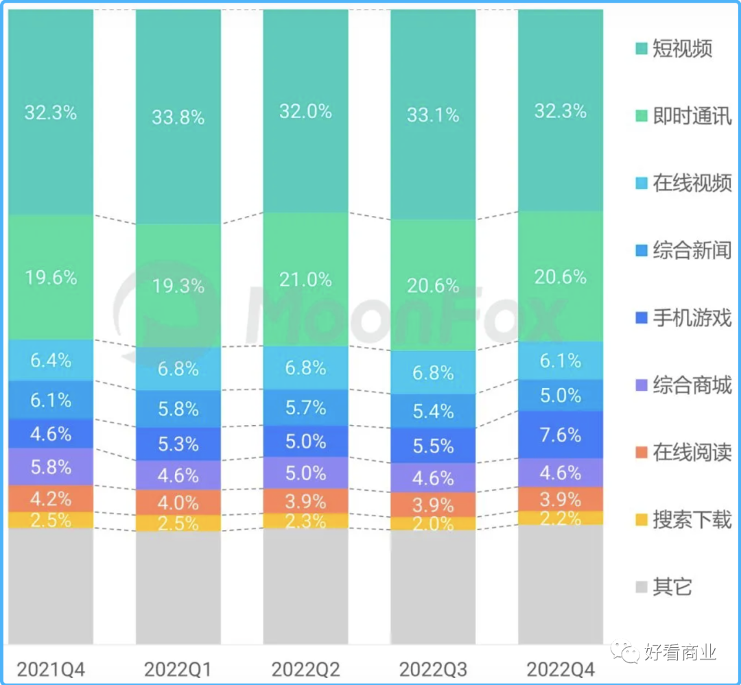據(jù)月狐的數(shù)據(jù),近一年內(nèi),移動網(wǎng)民每日觀看短視頻的時長占比為32.3%,在各種移動應(yīng)用中排名最高;綜合商城排名第六。