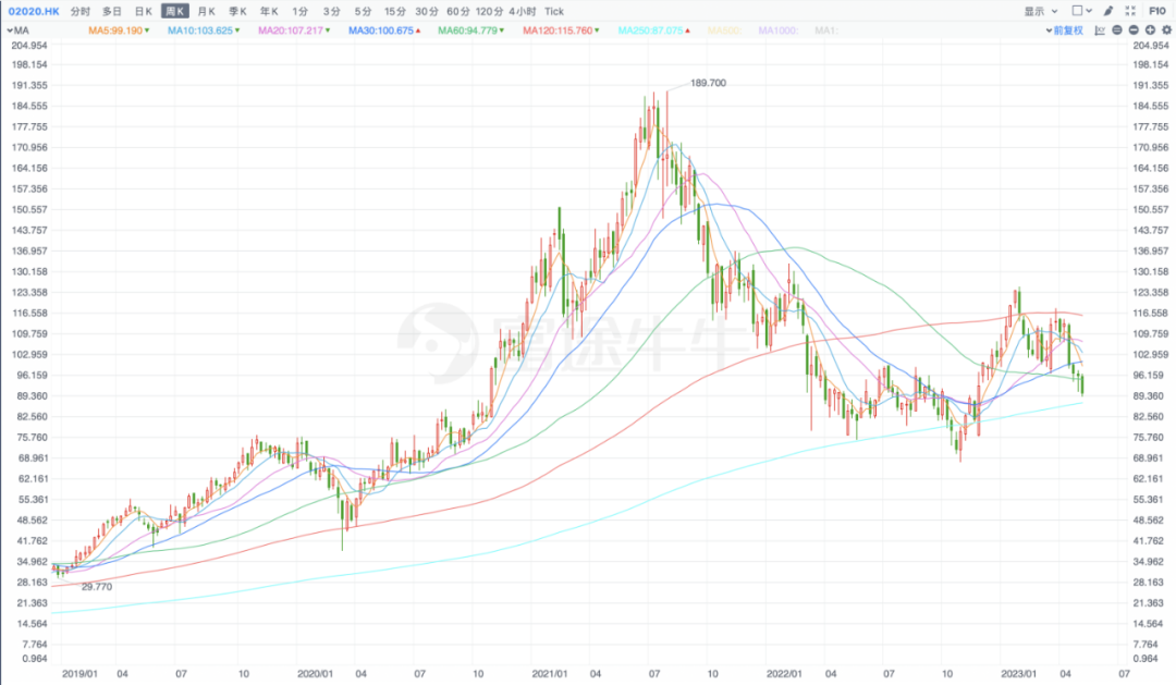 但若拉長時間線看市值,2021年6月29日,安踏總市值達到5023億港元,時到如今,近乎腰斬。