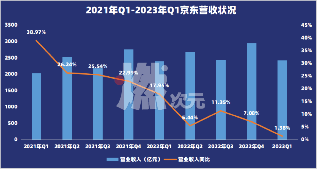 總的來看,京東2023年一季度的業(yè)績表現(xiàn)要高于市場預(yù)期。本季度實現(xiàn)營收2430億元(人民幣,以下為標(biāo)注則同),對此,京東稱之為“創(chuàng)造了一季度的歷史最佳盈利水平”,但同比增速僅為1.38%。在該季度國內(nèi)經(jīng)濟(jì)和消費整體復(fù)蘇的大背景下,1.38%的增速表現(xiàn)難言尚佳。