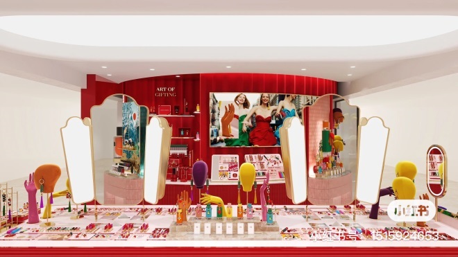 首店以紅色為主色調,中庭位置展臺設計個性鮮明,不同顏色的手臂模型置于展臺之上,與主色調大紅色完美融合,整個空間華麗奢華,讓消費者仿佛置身于宴會之中。