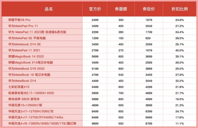 “電腦超級加補”活動華為系列產(chǎn)品中,官網(wǎng)價1299元的華為MatePad SE平板電腦券后價為929元,補貼達到28.5%;官網(wǎng)價為3499元的華為MatePad Pro 11券后降至2549元,補貼力度超27%;官網(wǎng)價2299元的華為 MatePad 11 2023款標準版&柔光版券后價1739元,補貼力度超24%。