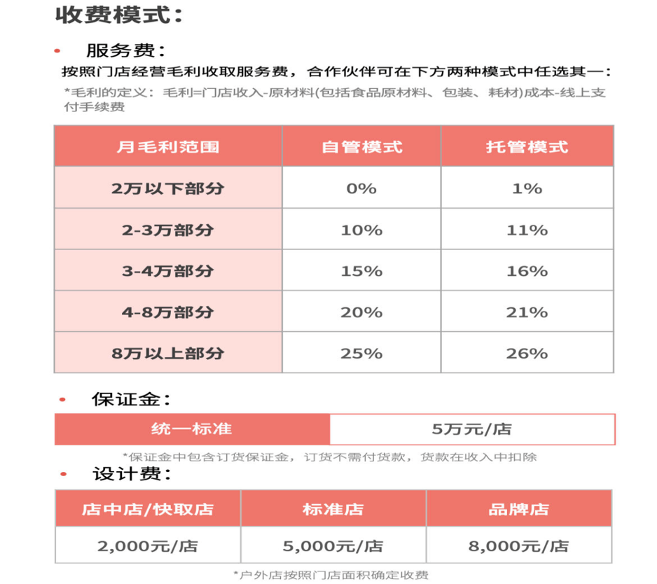 當(dāng)前,庫(kù)迪咖啡的加盟并無(wú)加盟費(fèi),僅收取5萬(wàn)元/店的保證金以及2000元起/店的設(shè)計(jì)費(fèi),后續(xù)總部提成從門店毛利潤(rùn)中分階梯抽成。