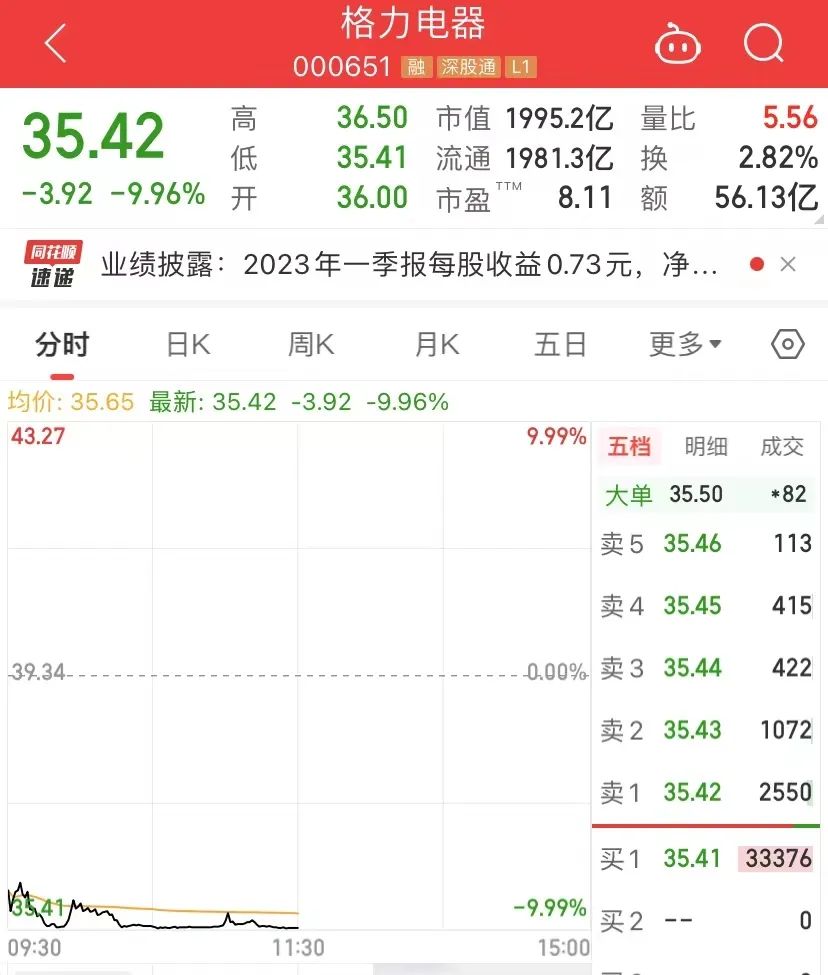 而截至5月4日格力財(cái)報(bào)發(fā)布當(dāng)天收盤,格力電器股價(jià)報(bào)收35.42元/股,相較于2020年市值巔峰蒸發(fā)了超過1300億。