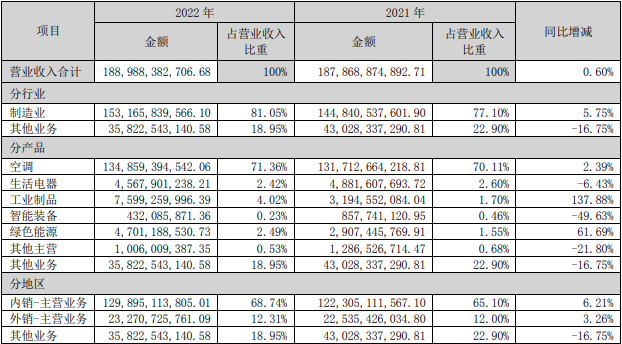 從財(cái)報(bào)上看,作為格力主營(yíng)業(yè)務(wù)的空調(diào)在2022年實(shí)現(xiàn)營(yíng)收1348.59億元,占收入比為71.36%,而像生活家電、綠色能源等其它業(yè)務(wù)合計(jì)營(yíng)收僅541.25億元,僅占收入比重的28.64%。
