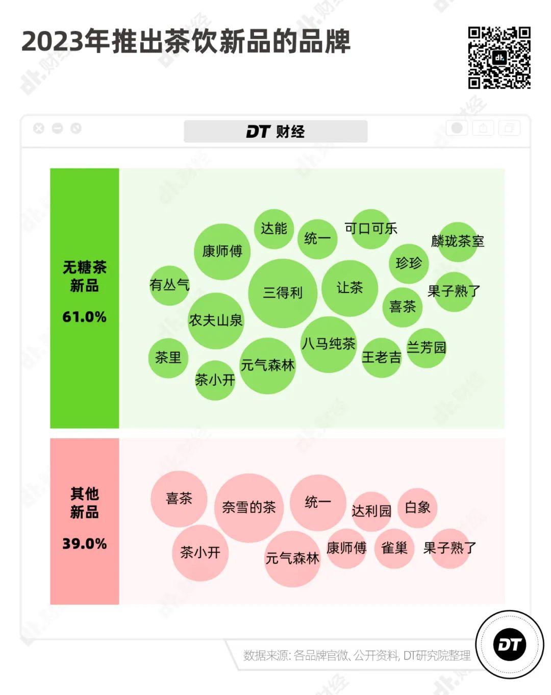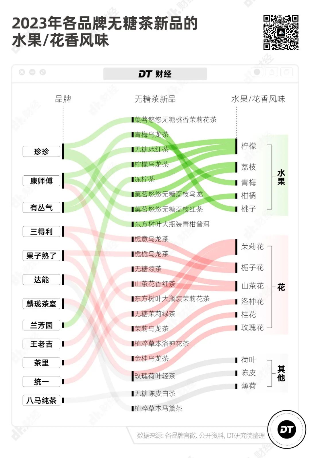 DT財(cái)經(jīng)統(tǒng)計(jì)了2023年41款茶飲料新品,發(fā)現(xiàn)其中無(wú)糖茶的創(chuàng)新超過(guò)6成(總計(jì)有18個(gè)品牌推出25款無(wú)糖茶新品、36種口味)。不僅是三得利、康師傅、農(nóng)夫山泉這些傳統(tǒng)茶飲品牌在無(wú)糖茶上下足了功夫,其他品牌也開(kāi)始在無(wú)糖茶上發(fā)力: