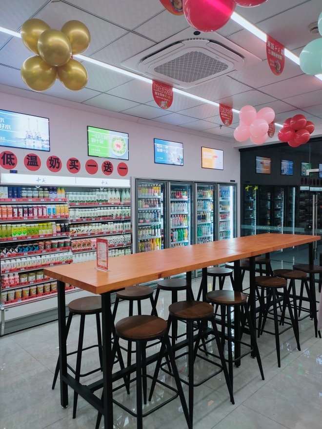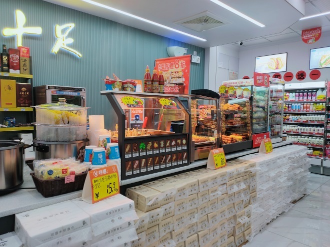 門店裝修和設計:門店采用第四代“十足”裝修風格,門店招牌設計突出表現(xiàn)品牌的統(tǒng)一性、獨立性,樹立特有的品牌形象。店內(nèi)設計方面,吧臺客動線流暢,鮮食設備齊全,品類豐富,門店采用收銀機加自助收銀機的方式,滿足顧客不同的需求,專注提升顧客的購物體驗。同時門店裝修精美的休閑區(qū)為顧客提供舒適的用餐、休息環(huán)境。