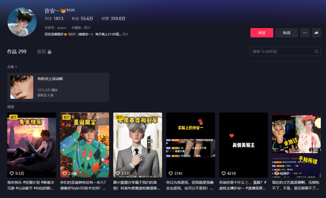 “許安一”是抖音頭部虛擬主播,為娛樂型虛擬主播,通常采取中之人“套皮”,用動捕演繹的模式。吉光喵科技是該虛擬主播的運(yùn)營方,該公司負(fù)責(zé)人玄子告訴億邦,由于他們的運(yùn)營模式和真人主播基本相同,過去也一直在以真人的標(biāo)準(zhǔn)接受平臺的管理,受公告的影響很小。