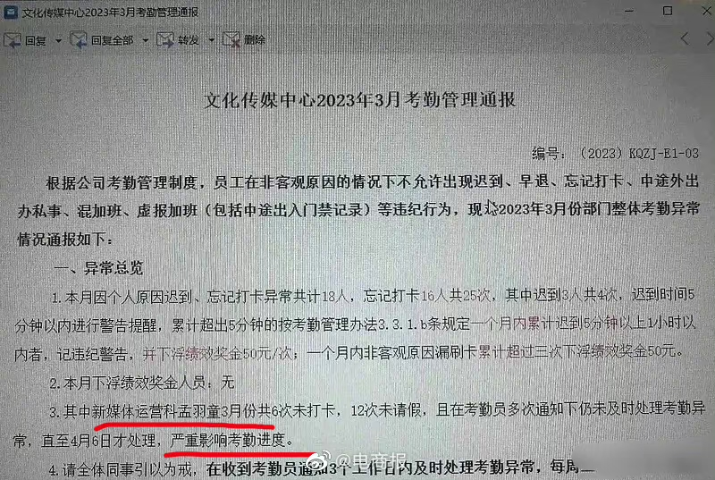 ▲格力文傳中心通報(bào)孟羽童的考勤問(wèn)題,圖片來(lái)自網(wǎng)絡(luò)。