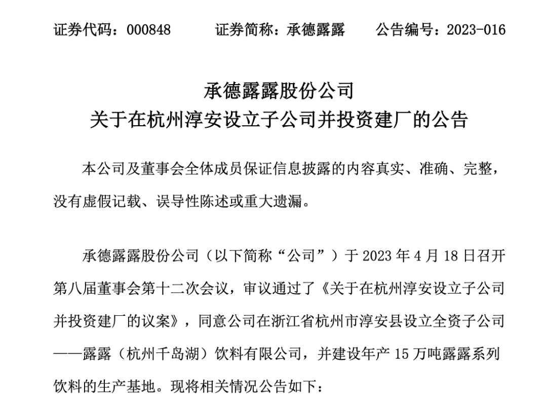 承德露露于4月20日發(fā)布公告,將在浙江省杭州市淳安縣設(shè)立全資子公司,露露(千島湖)飲料有限公司,新設(shè)子公司注冊資本10000 萬元人民幣,全部由公司現(xiàn)金出資,新設(shè)子公司擬投資3.65億元,建設(shè)年產(chǎn)15萬噸露露系列飲料生產(chǎn)基地,而根據(jù)公告內(nèi)容,此次投資主要建設(shè)內(nèi)容為新建廠房、購置設(shè)備等,擬安裝2條PET生產(chǎn)線、2條二片罐生產(chǎn)線,主要生產(chǎn)二片罐露露植物蛋白系列飲料和PET包裝為主的果汁及功能性水飲料。