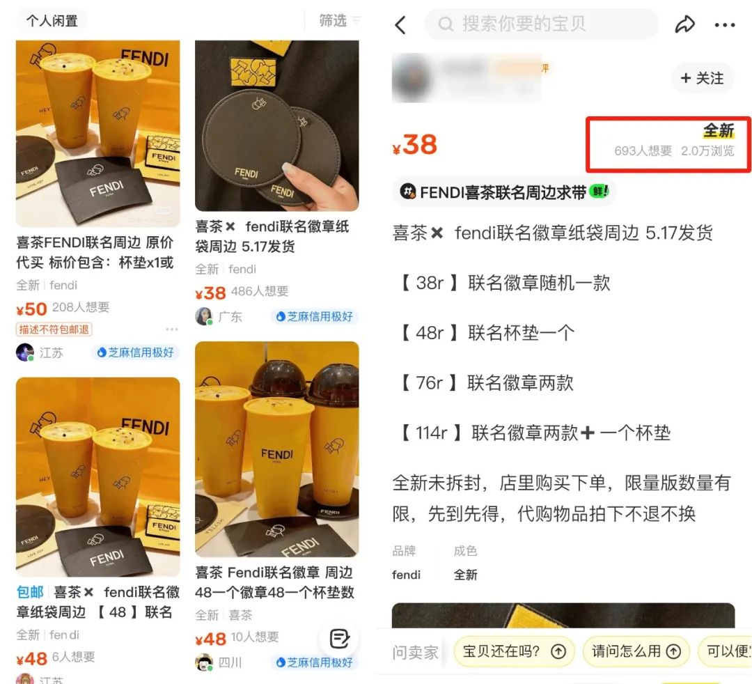 根據喜茶門店的規(guī)則,購買兩杯聯名奶茶就能獲得杯墊或隨機徽章,需要花38元。而在閑魚上接近700人點了“想要”的價格是:38元剛好能買到一個徽章,如果要全套(兩款聯名徽章+一個杯墊),需要118元拿下。