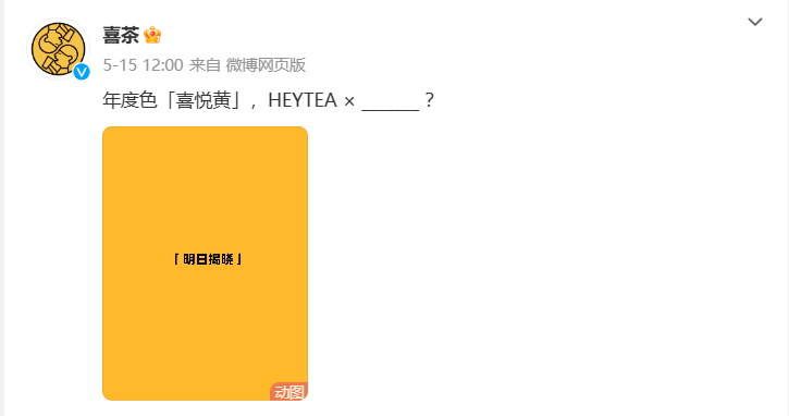 第二天,喜茶公布自己的年度色為“喜悅黃”,預告即將和某品牌聯名,16號揭曉。