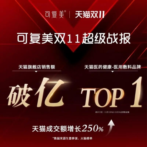 雙11期間,巨子生物旗下的王牌產(chǎn)品可復(fù)美僅13分鐘內(nèi)累計成交額突破一億元,位列天貓阿里健康類目敷料品牌TOP1,而這背后離不開薇婭直播間的助力。