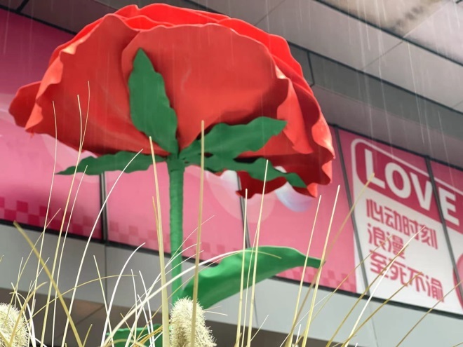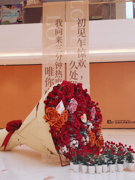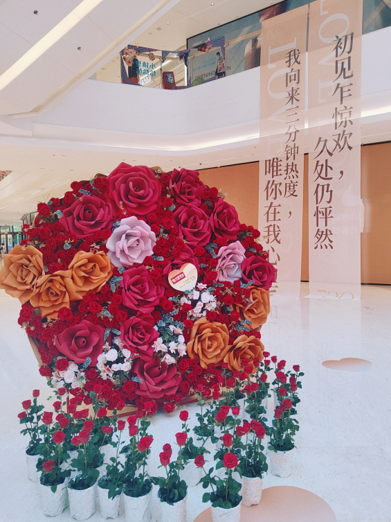 5月18日—21日,杭州大廈501城市廣場(chǎng)推出“健康生活、禮遇520”主題活動(dòng),在景曇路沿街?jǐn)[放巨型玫瑰花,營(yíng)造浪漫氣氛,為顧客營(yíng)造出一個(gè)溫馨浪漫的購(gòu)物環(huán)境。