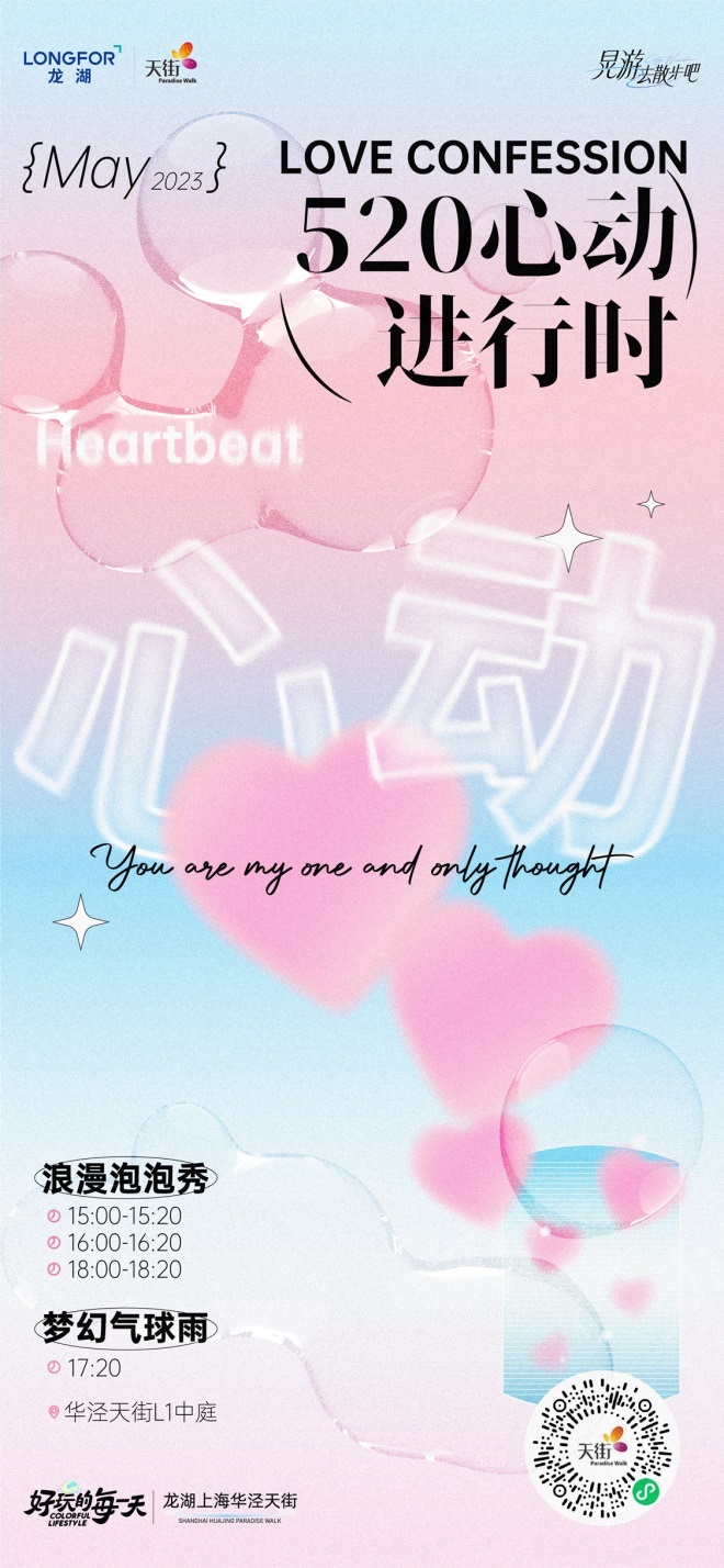 5月20日當(dāng)天,龍湖上海華涇天街將會(huì)舉辦浪漫泡泡秀和夢(mèng)幻氣球雨兩場(chǎng)活動(dòng),給節(jié)日增加浪漫氣氛。