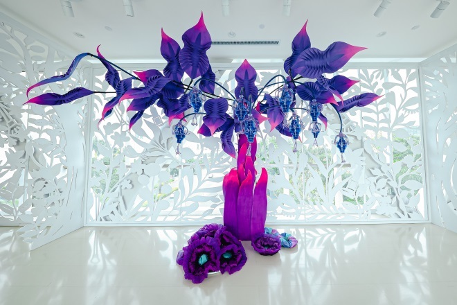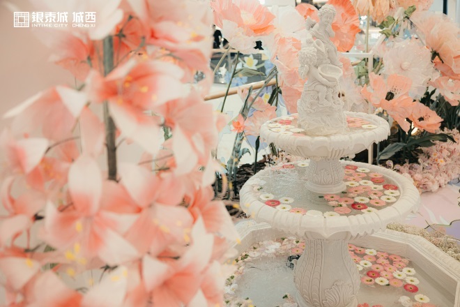 5月19日—6月18日,城西銀泰城聯(lián)手藝術(shù)家高筠、樂(lè)處空間,將巨型花園搬入城市中,共同舉辦了綺夢(mèng)花園藝術(shù)展,用真絲、折紙、紗網(wǎng)、燈光打造秘密花園秘境,共分為兩個(gè)部分,第一部分是被花花圍繞的夢(mèng)幻許愿池,第二部分是從商場(chǎng)空中傾瀉而下的20米繁華瀑布。