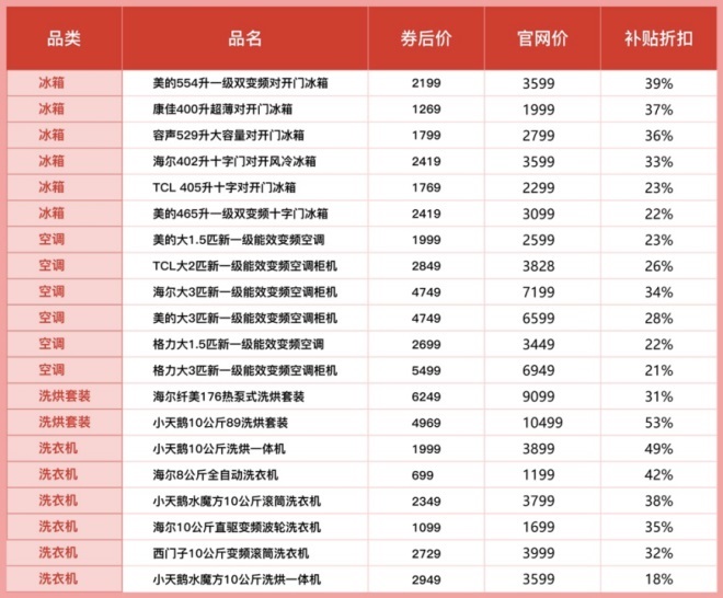 在冰箱品類中,官網(wǎng)價(jià)1999元的康佳400升超薄對(duì)開門冰箱,券后價(jià)1269元,補(bǔ)貼37%;官網(wǎng)價(jià)2799元的容聲529升大容量對(duì)開門冰箱,券后價(jià)1799元,補(bǔ)貼36%;官網(wǎng)價(jià)3599元的海爾402升十字門對(duì)開風(fēng)冷冰箱,券后僅需2419元,補(bǔ)貼33%;官網(wǎng)價(jià)2299元的TCL 405升十字對(duì)開門冰箱,券后降至1769元,補(bǔ)貼23%;官網(wǎng)價(jià)3099元的美的465升一級(jí)雙變頻十字門冰箱,券后僅需2419元。