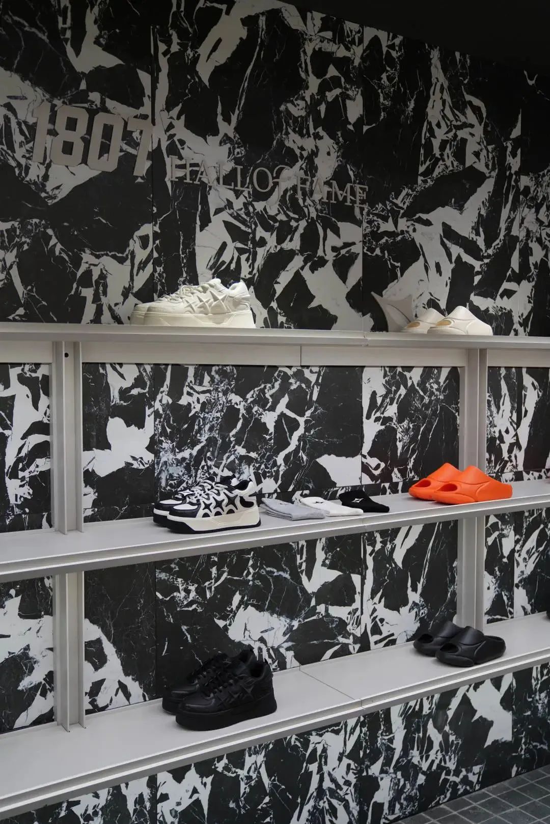 陳列部分延用了「改裝車庫」概念,室內(nèi)利用大理石的紋理、銀色金屬以及LED等元素彰顯構(gòu)筑未來風(fēng)格。整體淺灰色的色調(diào)與無影頂燈設(shè)計(jì),致力于為客戶帶來更加多元的空間感受。店鋪空間分為兩層,以空間的錯(cuò)落與視覺擴(kuò)張形態(tài),將1807品牌的穿搭風(fēng)格以及生活方式根植于其中。
