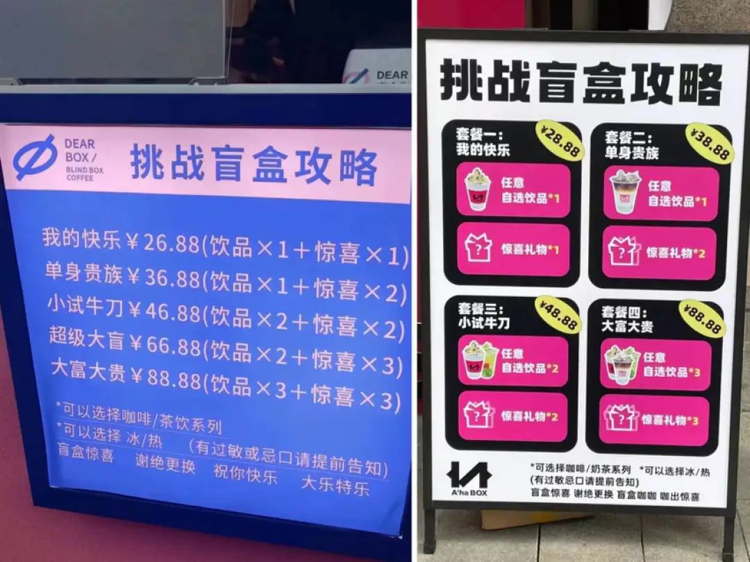 長沙開出的“盲盒咖啡”,名為“A'ha BOX”。A'ha BOX和前文提到過獲得融資的DEAR BOX,從門店裝飾到定價,不能說是很像,只能說是一模一樣,基本上是“Ctrl C”+“Ctrl V”復(fù)制粘貼過來的。就連點(diǎn)單名也沒有放過,因為咖啡的盲盒性質(zhì),“單身貴族”、“小試牛刀”、“大富大貴”等組合名稱也“學(xué)以致用”。