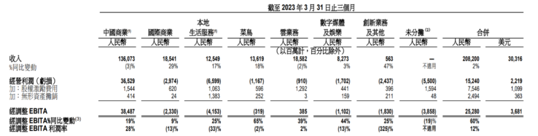 就利潤表現(xiàn)而言,阿里巴巴23Q1非國際準則凈利潤能夠取得38%的同比增速,主要源自中國商業(yè)分部盈利能力的進一步提高,以及創(chuàng)新業(yè)務的大幅減虧,例如菜鳥的經(jīng)調(diào)整EBITA虧損大幅縮窄65%,數(shù)字媒體及娛樂虧損則縮窄44%。