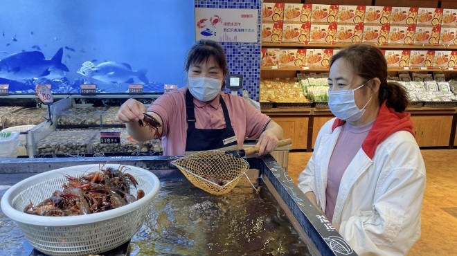 2021年公司開始水產(chǎn)自營的創(chuàng)建拓展工作,在當時沒有養(yǎng)殖專業(yè)、商品專業(yè)知識匱乏的情況下,可以說賣場內(nèi)所有人都對活魚海鮮的養(yǎng)殖、保鮮、商品特性鮮活度等等有關(guān)信息一無所知。就是在這樣一竅不通的情況下,沒有外力幫助黃孝云時常和水產(chǎn)采購請教,進行有關(guān)資料整理學習。在她努力學習取得成果后,總結(jié)水產(chǎn)養(yǎng)殖、海鮮養(yǎng)殖以及各種商品的特性甚至于烹飪手法都教給同事。跟顧客共同探討如何做才好吃,不但是顧客,更是朋友。黃孝云也經(jīng)常開玩笑說“我啊,不僅魚賣的好,我燒的更好,改明兒我請你吃全魚宴,包你嘗了后好吃的都咬舌頭”。就這樣,在大潤民超市水產(chǎn)組從無到有的這3年里,黃孝云努力鉆研,不僅在業(yè)務(wù)能力上對水產(chǎn)有了十足的提升,同時也收獲了大量的粉絲顧客。他們戲稱黃孝云為老黃,每次來都會吆喝一聲:“老黃給我來條魚!薄袄宵S給我搞點小龍蝦,我就喜歡你挑的小龍蝦,皮薄個大!币苍诖鬂櫭癯袠淞⒘艘粋標桿,成為大家努力學習和超越的目標。
