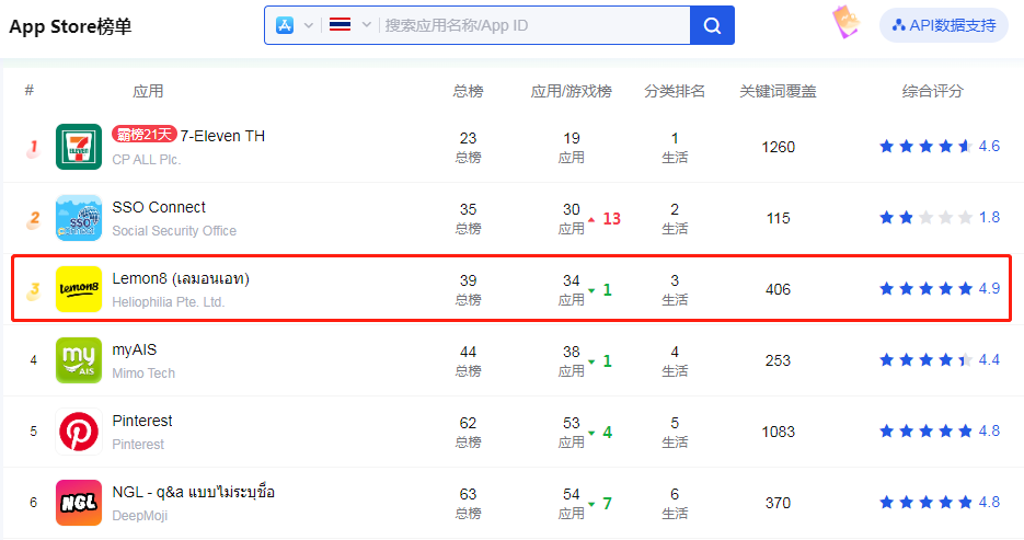 截至5月9日,Lemon8在泰國生活榜應(yīng)用中排名第三,圖源點點數(shù)據(jù)