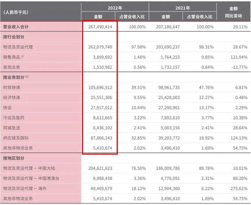 順豐2022年年報(bào)顯示,供應(yīng)鏈和國(guó)際業(yè)務(wù)營(yíng)收同比增長(zhǎng)124.13%,是順豐各業(yè)務(wù)板塊中增速最快的業(yè)務(wù),占總營(yíng)收的比重也從2021年的18.92%增加至32.85%。