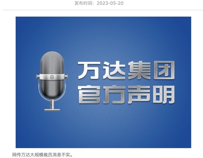 對(duì)此,5月20日,大連萬達(dá)集團(tuán)發(fā)布了申明稱:“網(wǎng)傳萬達(dá)大規(guī)模裁員消息不實(shí)”。