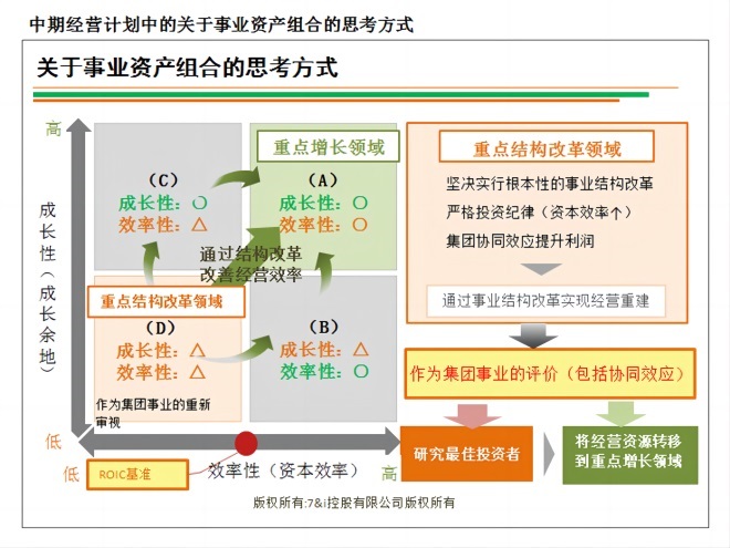 然后將增長(zhǎng)性和效率性都較低的業(yè)務(wù)劃分為“重點(diǎn)結(jié)構(gòu)改革領(lǐng)域”,最終將“考慮最佳投資者”→“將經(jīng)營(yíng)資源轉(zhuǎn)移至重點(diǎn)增長(zhǎng)領(lǐng)域”。非常清楚地暗示將出售部分領(lǐng)域的資源。