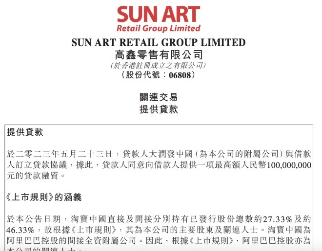公告顯示,2023年5月23日,貸款人高鑫零售附屬公司大潤(rùn)發(fā)中國(guó)(康成投資(中國(guó))有限公司)與借款人上海潤(rùn)盒網(wǎng)絡(luò)科技有限公司訂立貸款協(xié)議,據(jù)此,貸款人同意向借款人提供一項(xiàng)最高額人民幣1億元的貸款融資。