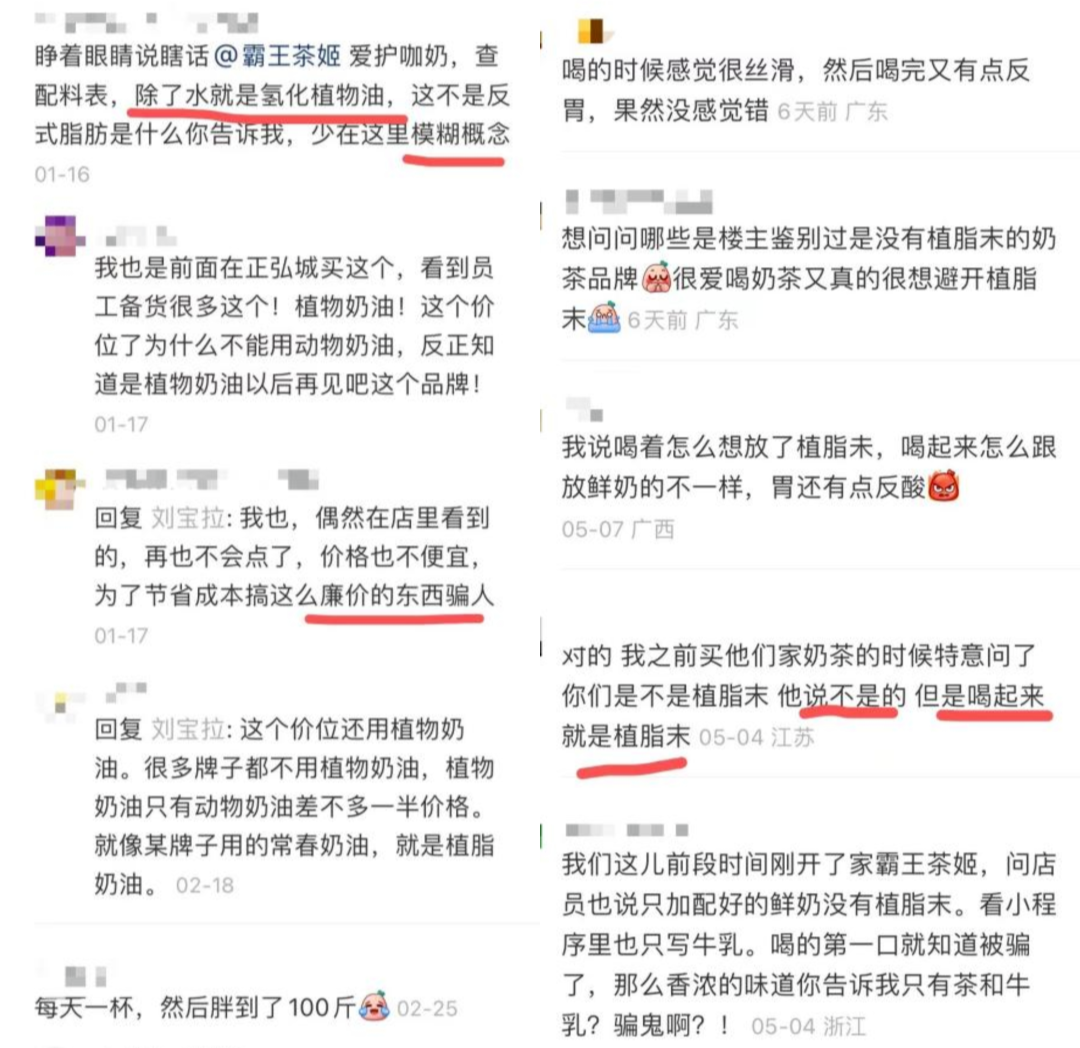 對(duì)此,該帖子下面就有部分了解植脂末的消費(fèi)者稱霸王茶姬在偷換概念。此外,小紅書還有多篇關(guān)于霸王茶姬使用植脂末的筆記,相關(guān)評(píng)論多達(dá)千條,多數(shù)網(wǎng)友憤怒表示“這就是欺騙消費(fèi)者”。