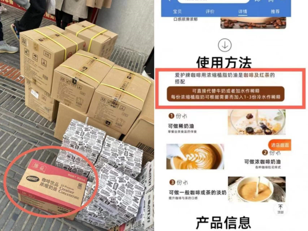 圖中顯示的是霸王茶姬的原材料產(chǎn)品,其中有一項(xiàng)赫然顯示“咖啡飲品濃縮奶茶”,這款為愛護(hù)的咖啡具體產(chǎn)品信息為濃縮植脂奶油,也就是植物奶油,等同于植脂末。