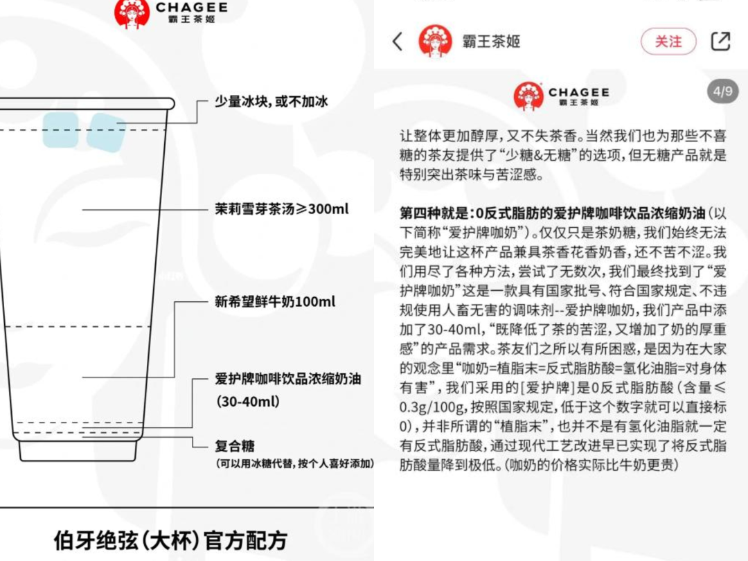 雖然一直宣傳為“鮮奶+茶”,但霸王茶姬為標(biāo)榜純鮮奶,并且稱所用咖奶產(chǎn)品中的反式脂肪酸低于國家規(guī)定,因此就并非所謂的“植脂末”,霸王茶姬可謂是將“摳字眼”的能力發(fā)揮到了極致。