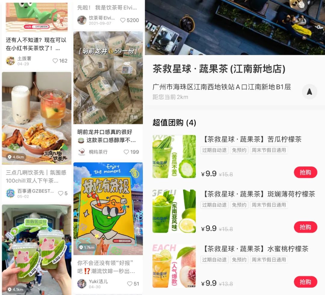 伯虎財(cái)經(jīng)在小紅書隨機(jī)搜索“三點(diǎn)幾咧飲茶先”,就能看到許多附帶該標(biāo)簽的探店圖文,而且不少內(nèi)容下都直接附帶了團(tuán)購鏈接,點(diǎn)擊即可進(jìn)店搶購,實(shí)現(xiàn)站內(nèi)交易。