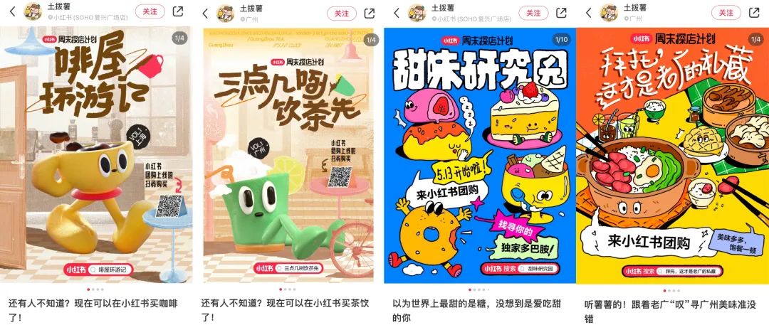 4月下旬,小紅書本地生活官方賬號(hào)“土撥薯”接連在上海、廣州上線了多期團(tuán)購活動(dòng),包括“啡屋環(huán)游記”“三點(diǎn)幾咧飲茶先”“甜味研究園”“拜托這才是老廣的私藏”等“周末探店計(jì)劃”,涵蓋咖啡、新茶飲、甜品、粵菜等美食品類。
