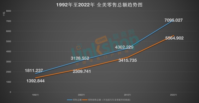 然而,過去三十年,全美零售總額卻逆勢增長了近兩倍。據(jù)美國人口普查局(Census Department)調(diào)查,全國零售業(yè)中無一部門出現(xiàn)頹勢。