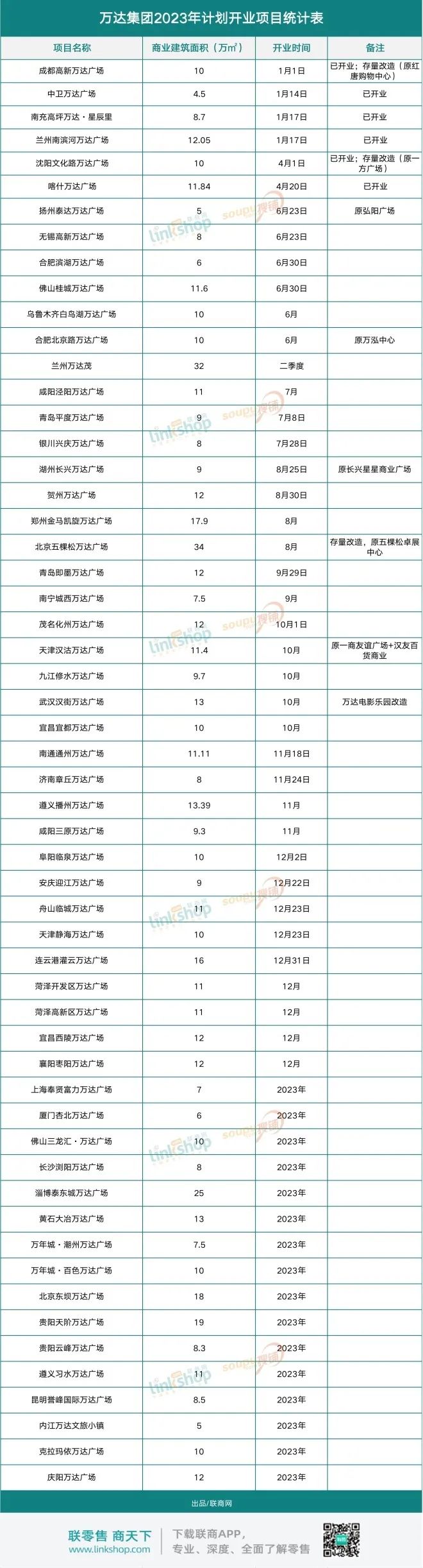 2023年,全年預(yù)計約56座萬達商業(yè)項目將開業(yè),除了南充高坪萬達·星辰里、蘭州萬達茂、內(nèi)江萬達文旅小鎮(zhèn)外,其余均為萬達廣場項目。
