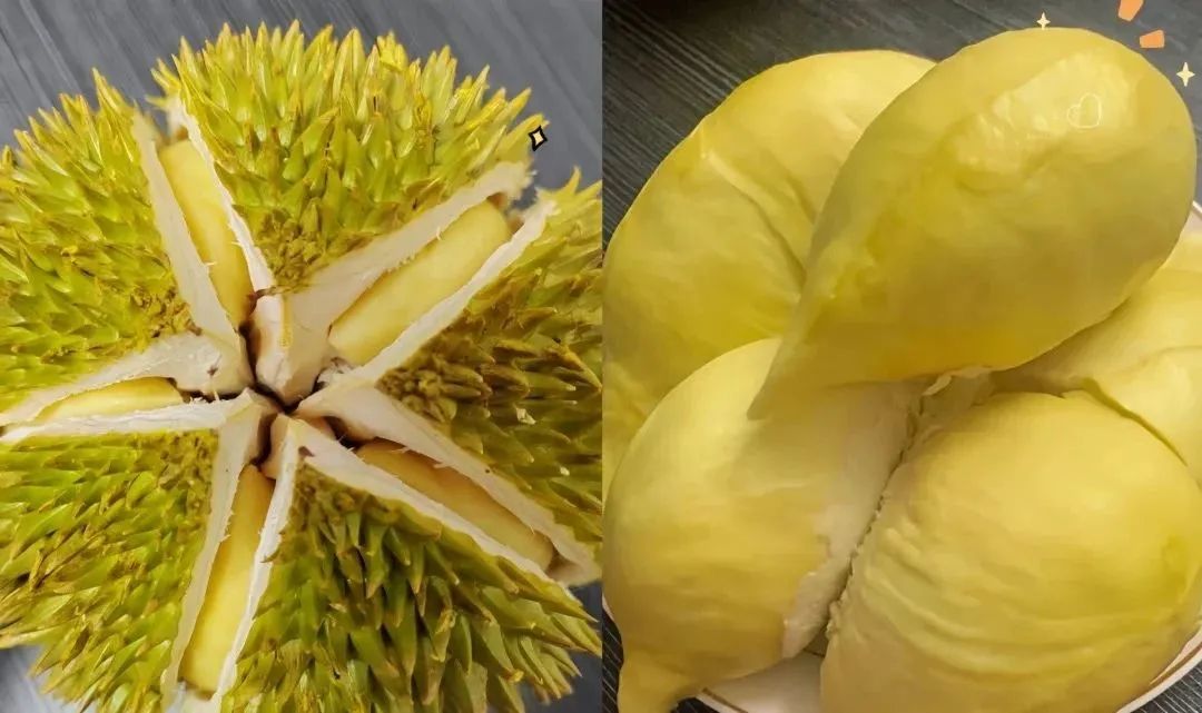 “報(bào)恩榴蓮”,皮薄肉厚。視頻拍攝者往往會(huì)在剛打開(kāi)時(shí)驚呼一聲,然后緩緩打開(kāi)榴蓮殼,壓抑著興奮,小心翼翼地拿出每一房黃金飽滿(mǎn)的榴蓮。