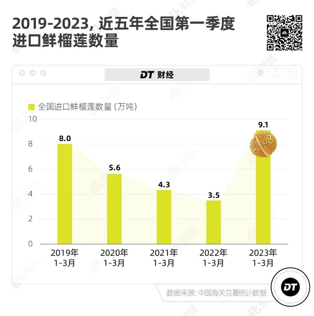 根據(jù)中國(guó)海關(guān)總署的數(shù)據(jù),2023年第一季度全國(guó)進(jìn)口鮮榴蓮一共9.1萬(wàn)噸,是近五年同期進(jìn)口數(shù)量最高的一年,甚至超過(guò)疫情爆發(fā)前的2019年。