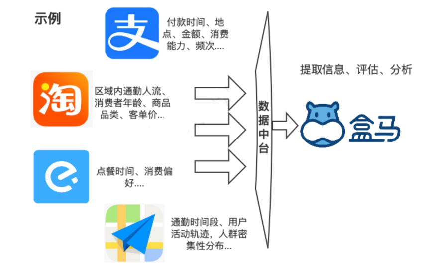 比如在開(kāi)店選址上,盒馬會(huì)先劃定范圍,中臺(tái)將意向選址點(diǎn)區(qū)域方圓5 km內(nèi)使用如淘寶、支付寶、餓了么、高德等用戶的畫(huà)像和行為數(shù)據(jù),開(kāi)放給盒馬。通過(guò)這些數(shù)據(jù),再進(jìn)一步去評(píng)估潛在用戶的消費(fèi)意向,來(lái)為選址決策參考,并確定店內(nèi)上架商品類(lèi)型和數(shù)量。