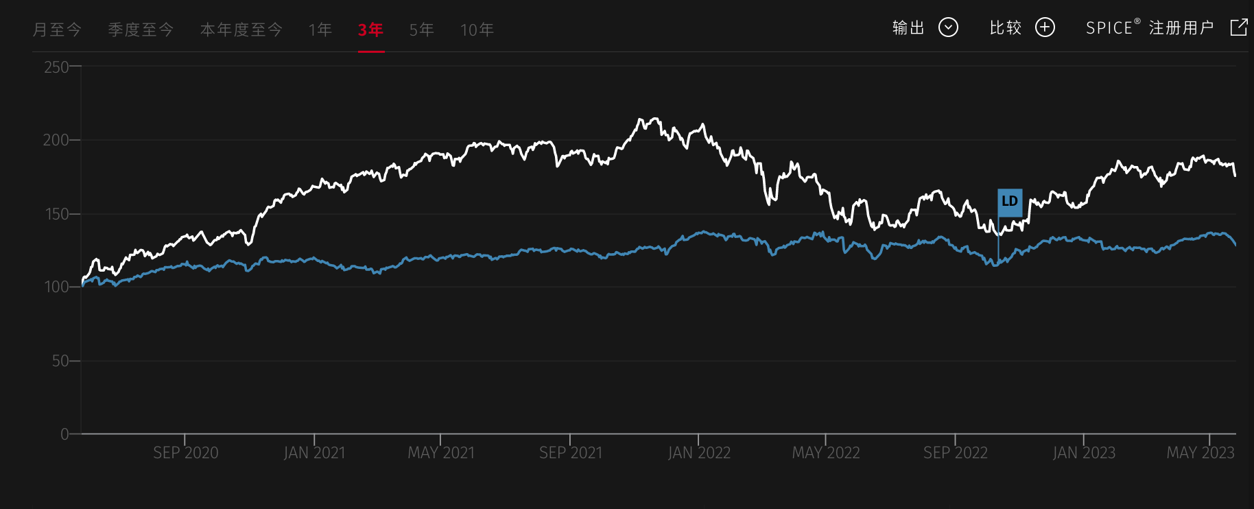 過去三年,標(biāo)普高端消費品指數(shù)(白線)明顯跑贏必選消費品指數(shù)(藍線) 來源:spglobal