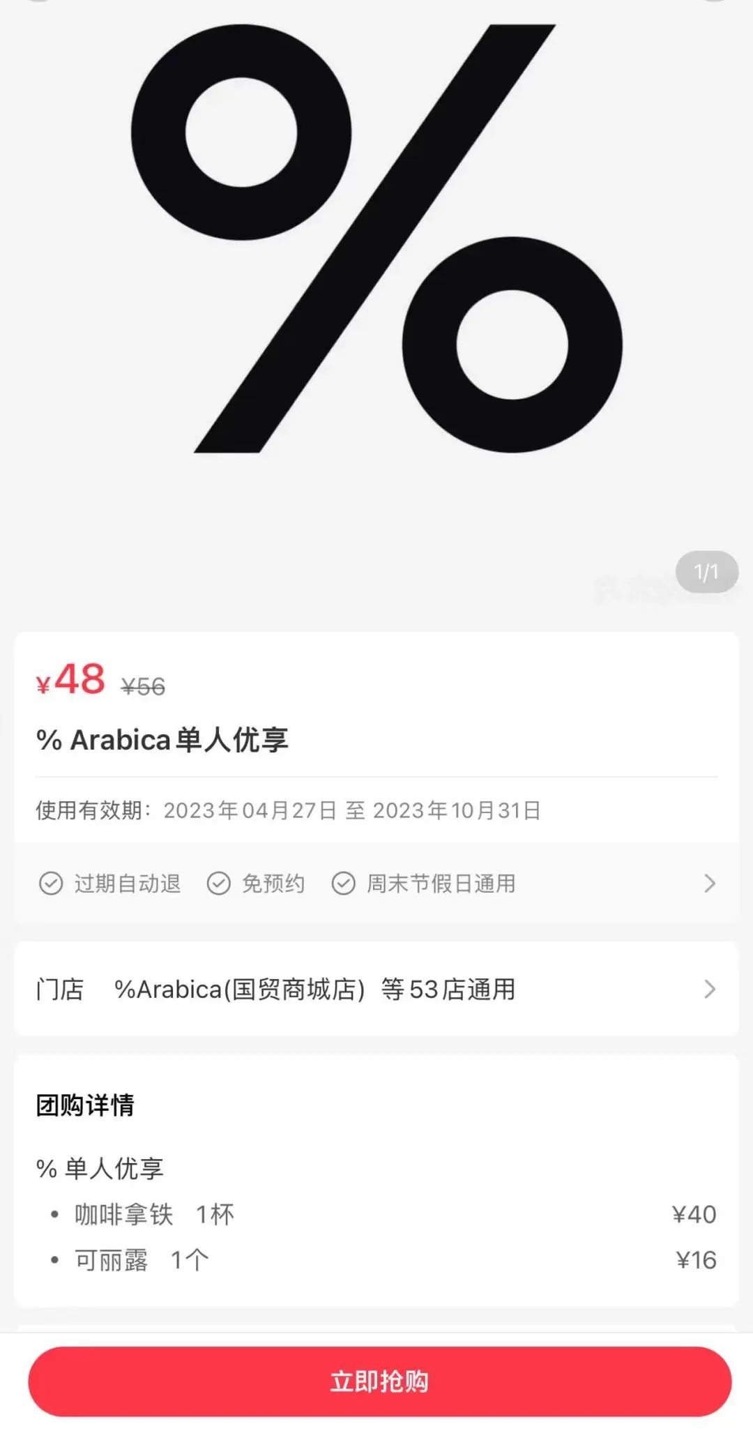 盒飯財(cái)經(jīng)發(fā)現(xiàn),網(wǎng)紅咖啡店%Arabica目前在抖音暫未上架團(tuán)購(gòu)商品,但成為了首批在小紅書上架團(tuán)購(gòu)商品的咖啡品牌商家,其在小紅書上架的團(tuán)購(gòu)套餐包括48元的單人套餐——?jiǎng)偤帽却蟊婞c(diǎn)評(píng)低一元。