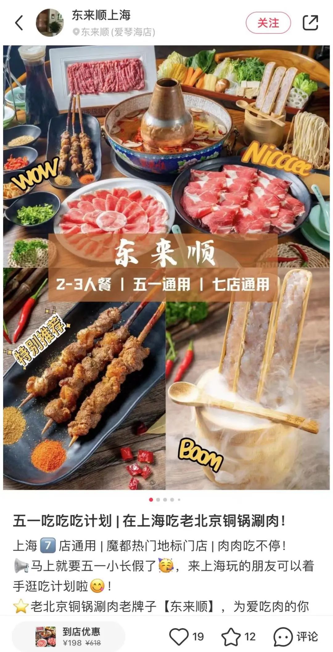 小紅書賬號(hào)“東來(lái)順上!痹4月24日發(fā)布首條筆記,并掛了“到店優(yōu)惠”鏈接,鏈接內(nèi)容為198元的2-3人套餐。另外,小紅書為商家主頁(yè)設(shè)置了“門店團(tuán)購(gòu)”板塊,點(diǎn)擊進(jìn)入后可查看商家門店列表,各個(gè)門店主頁(yè)同樣展示團(tuán)購(gòu)套餐。